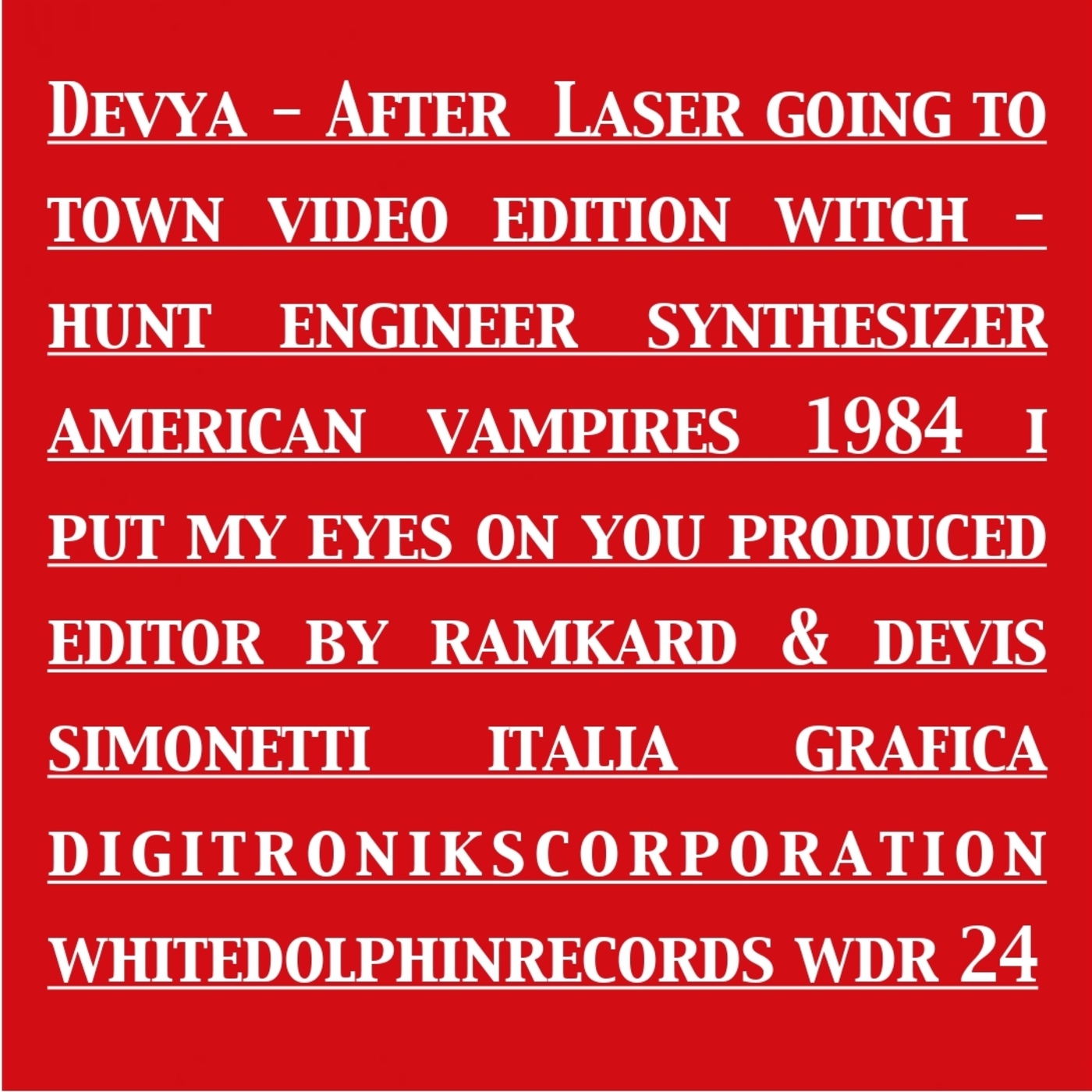 Distribuito da Routenote e licenziato dalla Label alternativa White Dolphin Records, “After Laser” è il nuovo extended play del progetto udinese Devya. La nuova edizione contiene quattro singoli estrapolati da diversi album. La copertina a cura della Digitroniks Corporation é ispirata all’ album post–punk dei Section 25 “Always Now” dei fratelli Cassidy. il disco apre con il digital 45 “Going To Town” in questo caso rilasciata la versione video. La traccia prodotta , registrata e cantata interamente da Devis Simonetti è il quarto singolo estratto dal primo album dei Devya “I Don’t Know What Is Christmas”.