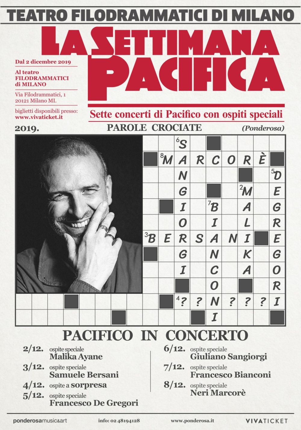 «Dal 2 all’8 dicembre 2019. Sette giorni al Teatro Filodrammatici, il piccolo ma inarrestabile cuore di Milano – racconta Pacifico sui suoi profili social – Sette miei concerti, le canzoni pescate da tutti i miei dischi. Sette magnifici ospiti. Uno a sorpresa, ma potete venire a scatola chiusa, sarà una serata grande al pari delle altre».
