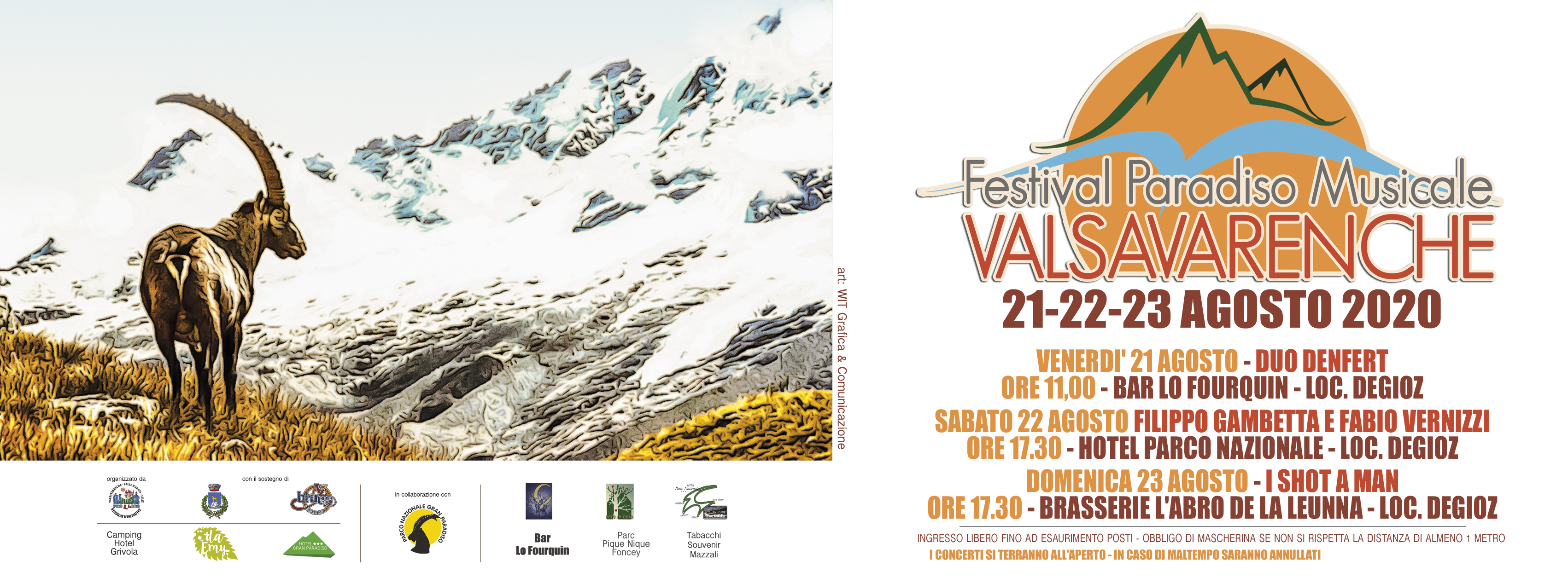 Per questa 6° edizione del Festival Paradiso Musicale a Valsavarenche (Aosta) – 21-23 agosto 2020 – si esibiranno il Duo Denfert, Filippo Gambetta e Fabio Vernizzi, e gli I Shot A Man, un’edizione più intima nel rispetto delle norme e dei regolamenti sanitari, sempre immersi in una delle più belle ed incontaminate oasi naturalistiche delle nostre Alpi.