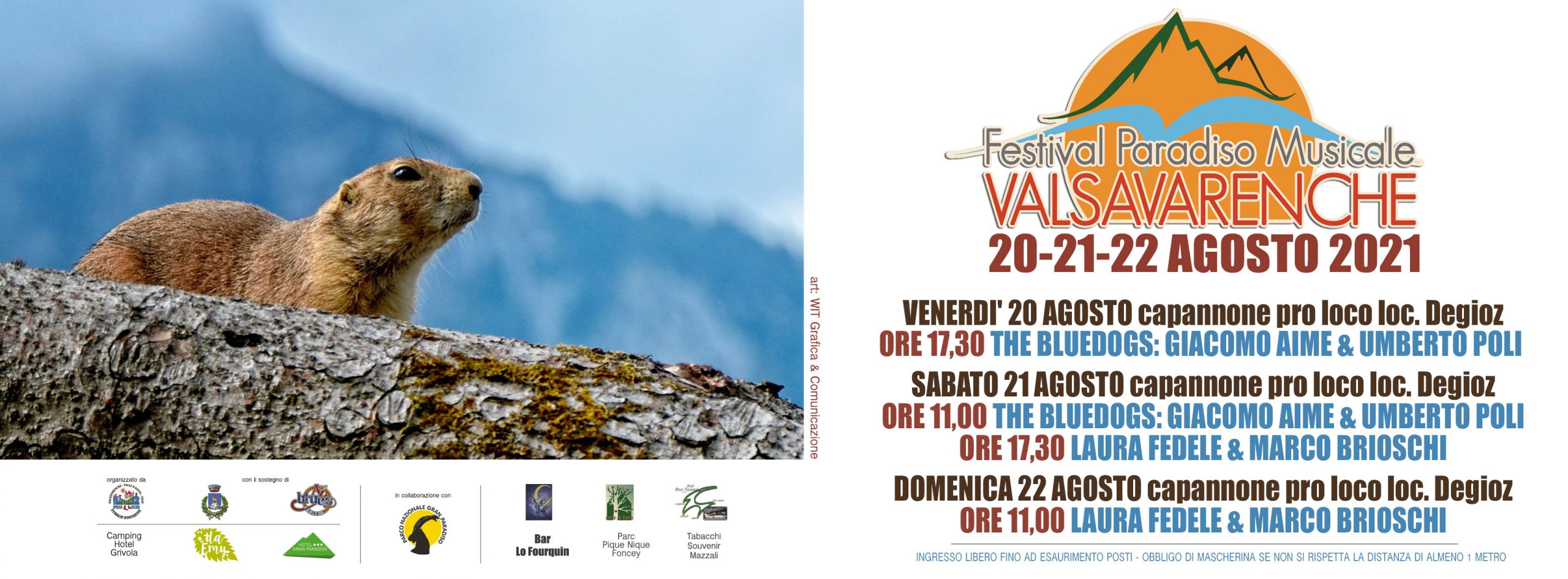 Per la 7° edizione del Festival Paradiso Musicale a Valsavarenche (AO) – 20-22 agosto 2021 – si esibiranno The Bluedogs, Giacomo Aime e Umberto Poli, e il duo composto da Laura Fedele e Marco Brioschi, anche quest’anno avremo un’edizione più intima nel rispetto delle norme e dei regolamenti sanitari, sempre immersi in una delle più belle ed incontaminate oasi naturalistiche delle nostre Alpi.