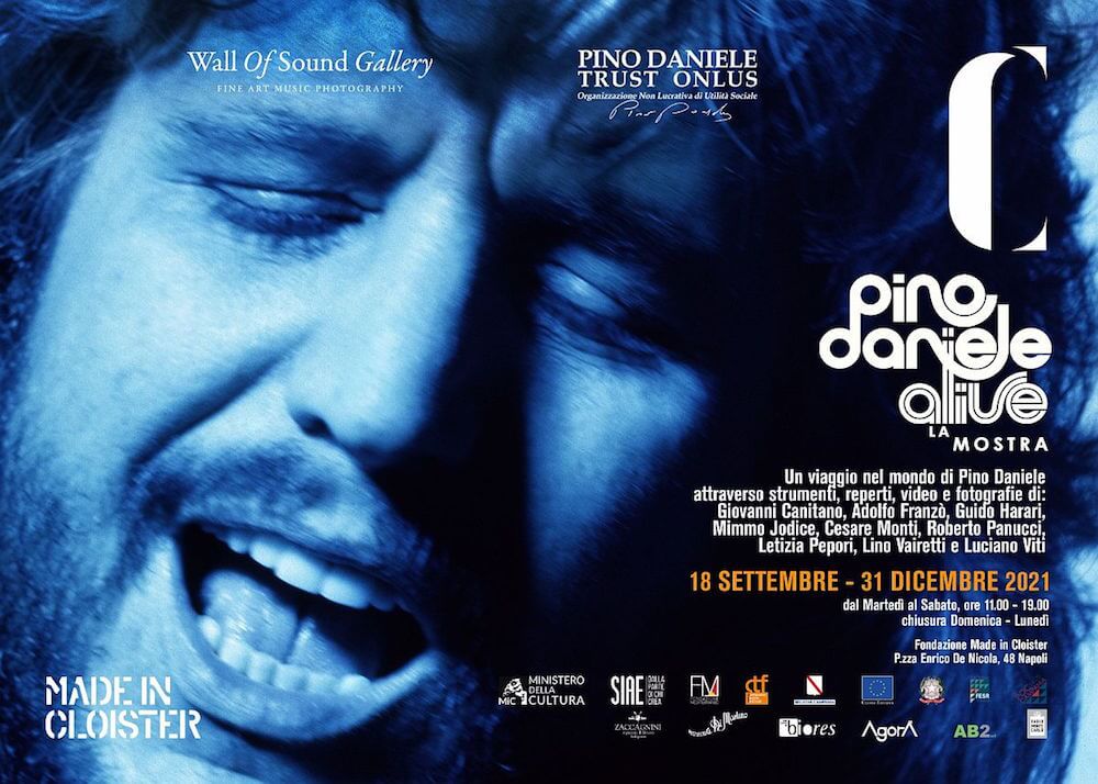 Pino Daniele Trust Onlus unisce le forze con Fondazione Made in Cloistere Wall of Sound Gallery per celebrare l’indimenticabile artista partenopeo Pino Daniele con “Pino Daniele Alive, la mostra”, un progetto espositivo multimediale che resterà a Napoli, presso il complesso di Santa Caterina a Formiello, sede della Fondazione, da domani, sabato 18 settembre, al 31 dicembre 2021.