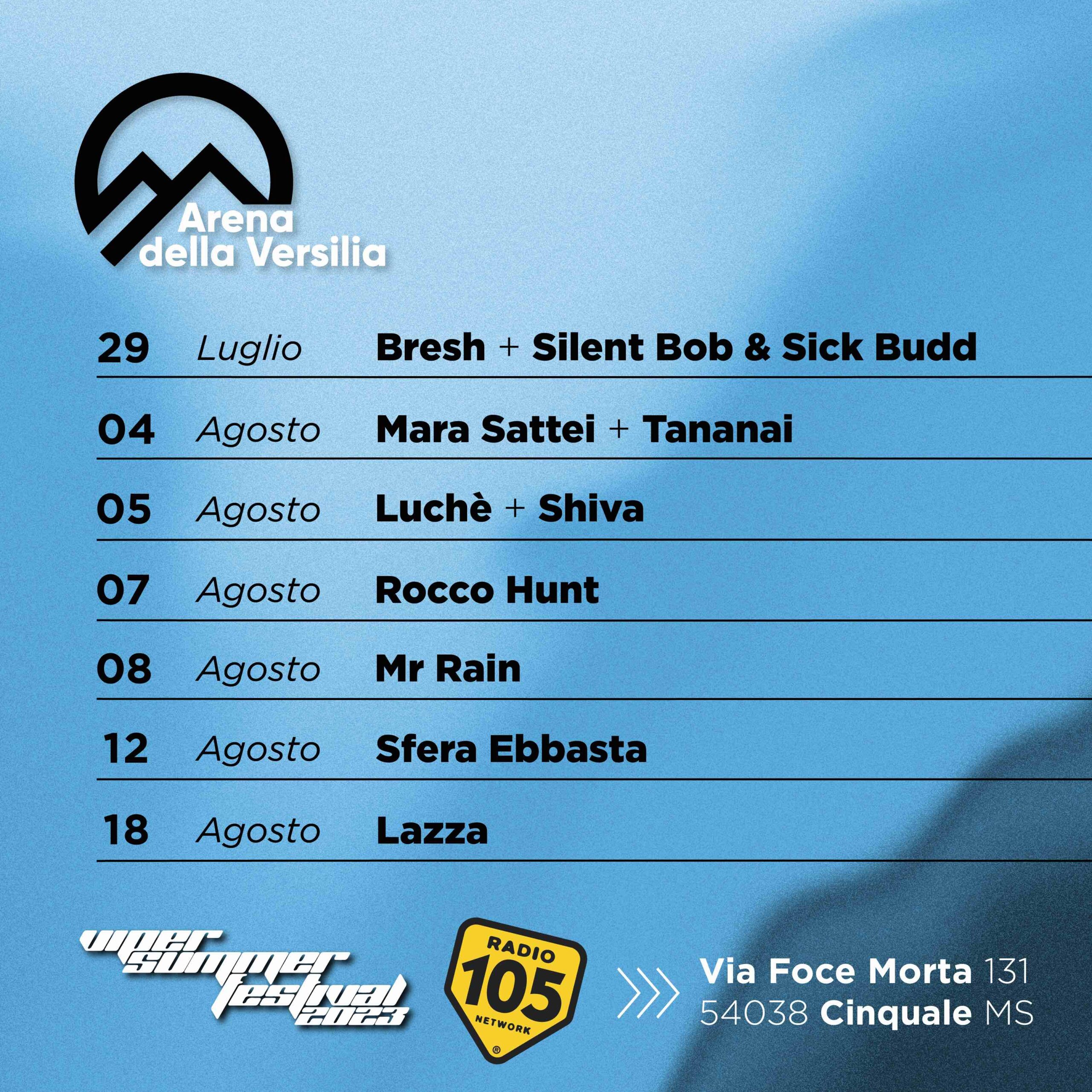 Nella meravigliosa cornice dell’Arena della Versilia, l’estate 2023 si accende con il meglio della musica internazionale. Grandi artisti come Lazza, Mara Sattei, Tananai, Mr Rain, Sfera Ebbasta, Luchè, Shiva, Bresh Silent Bob & Sick Budd e Rocco Hunt al Viper Summer Festival, Vibe Production daranno vita al ricco calendario di appuntamenti che riserverà ancora tante sorprese last minute, per un’estate all’insegna del divertimento e dello stare insieme.