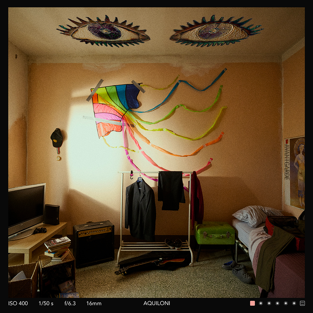 Guardando l’artwork di “Aquiloni” ci ritroviamo all’interno di una camera. Tutto è silente e fermo. Anche il frame che fa da cornice all’immagine suggerisce l’idea di una fotografia, uno scatto che si vuole ricordare. Sulla parete centrale, un aquilone, simbolo di libertà e di spensieratezza, ma che in questo caso è attaccato al muro, quasi a volerlo tenere lì con la forza. Un promemoria di un mondo leggero e colorato, all’interno di una stanza vecchia. Sul soffitto due occhi, antichi e scrutatori, una sorta di contatto dall’esterno – forse noi stessi che ci guardiamo dentro?