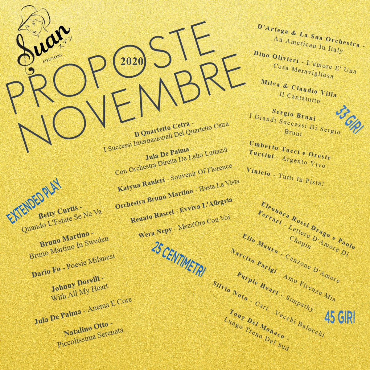 Ma la SUAN Edizioni non si ferma qui: la digitalizzazione dei vinili dimenticati non è che la prima di una serie di iniziative editoriali per salvare, ricostruire, riorganizzare, preservare e ristampare una immensa parte del patrimonio discografico italiano non più fruibile da molti decenni.