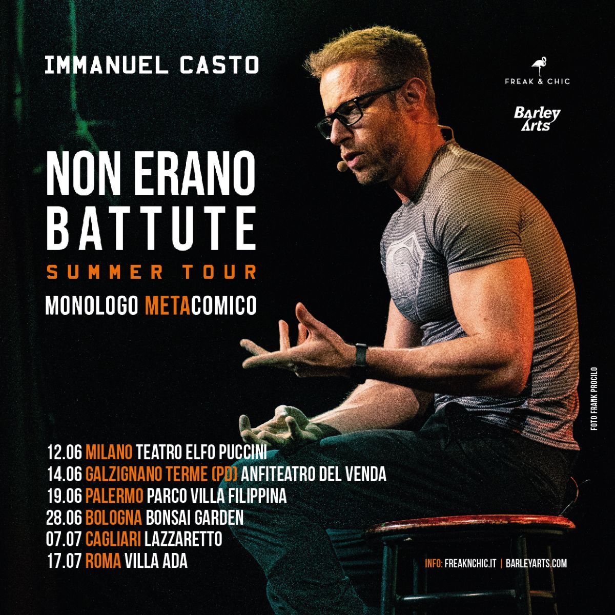 Dopo i 30 SOLD OUT nelle 33 date nei teatri e nei club italiani, IMMANUEL CASTO annuncia le prime date del tour estivo di NON ERANO BATTUTE, il monologo meta-comico che sviluppa i temi del mondo della comunicazione spesso affrontati dall’artista sui suoi canali social.