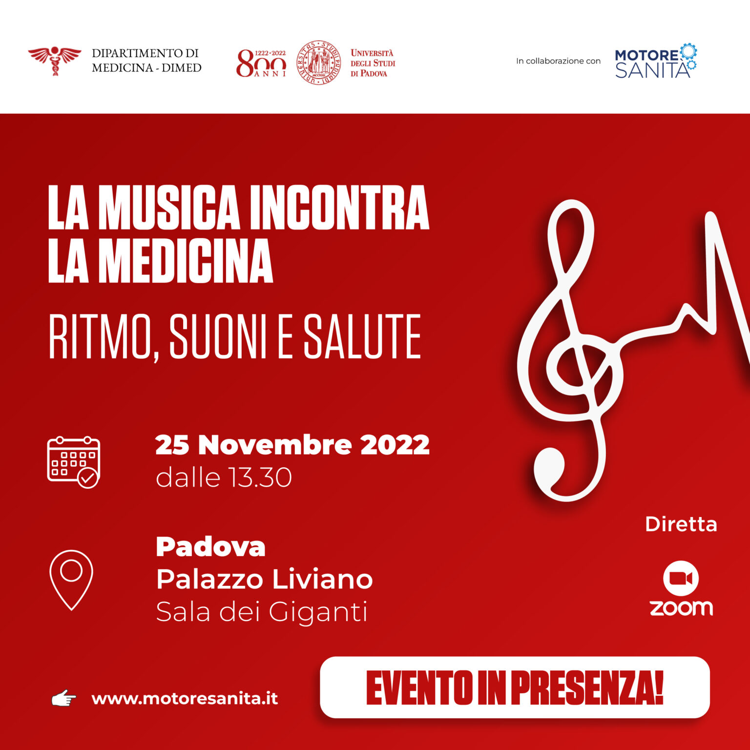 Da mercoledì 23 a venerdì 25 novembre, nella Sala dei Giganti di Palazzo Liviano, si terrà l’evento dal titolo “La musica incontra la medicina. Ritmo, suoni e salute” per sottolineare l’importanza dell’apporto musicoterapico, non ancora stabilmente adottato nella pratica clinica delle realtà italiane, approfondendo il ruolo della musica, in particolare del ritmo, e alcuni degli effetti che essa induce su un piano organico e psichico in vari ambiti patologici.
