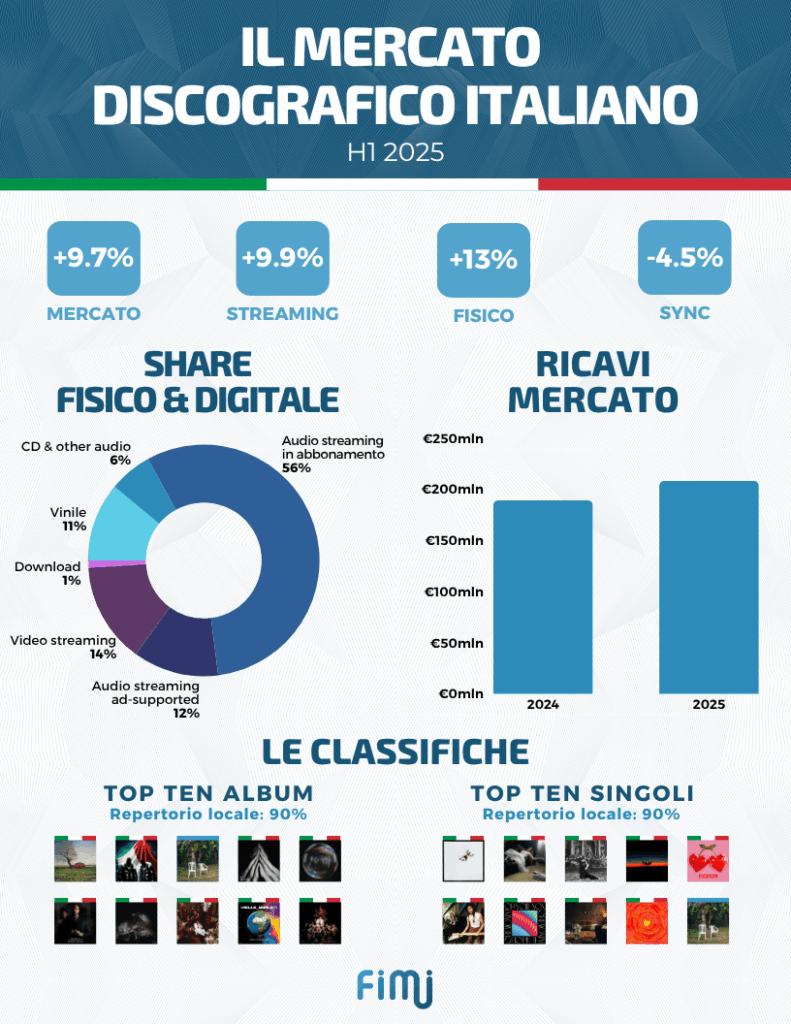 È una crescita solida, quella del mercato della musica nel primo semestre 2025, che con un fatturato di più di 208 milioni euro segna +9,7% grazie a un aumento dei ricavi di quasi tutti i comparti.