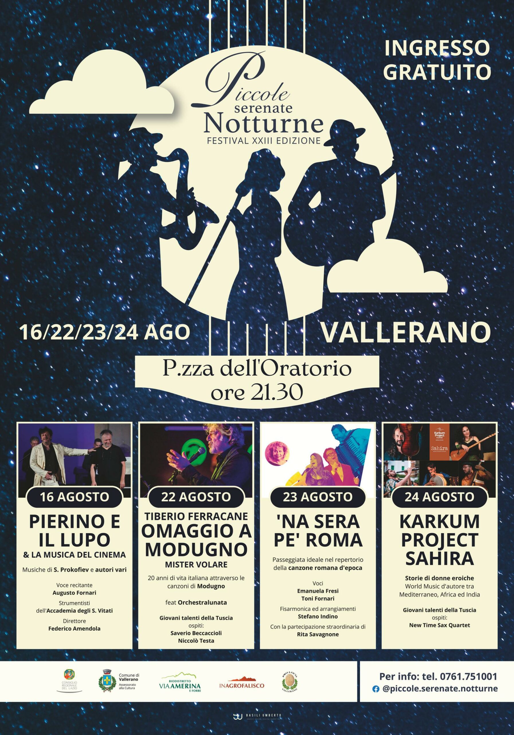 Torna per la ventitreesima volta a Vallerano il festival Piccole Serenate Notturne, una manifestazione che vuole valorizzare questo territorio, autentico gioiello della Tuscia viterbese, con una serie di progetti musicali narrativi che, come da tradizione, si svolge nel suggestivo scenario di Piazza dell’Oratorio.