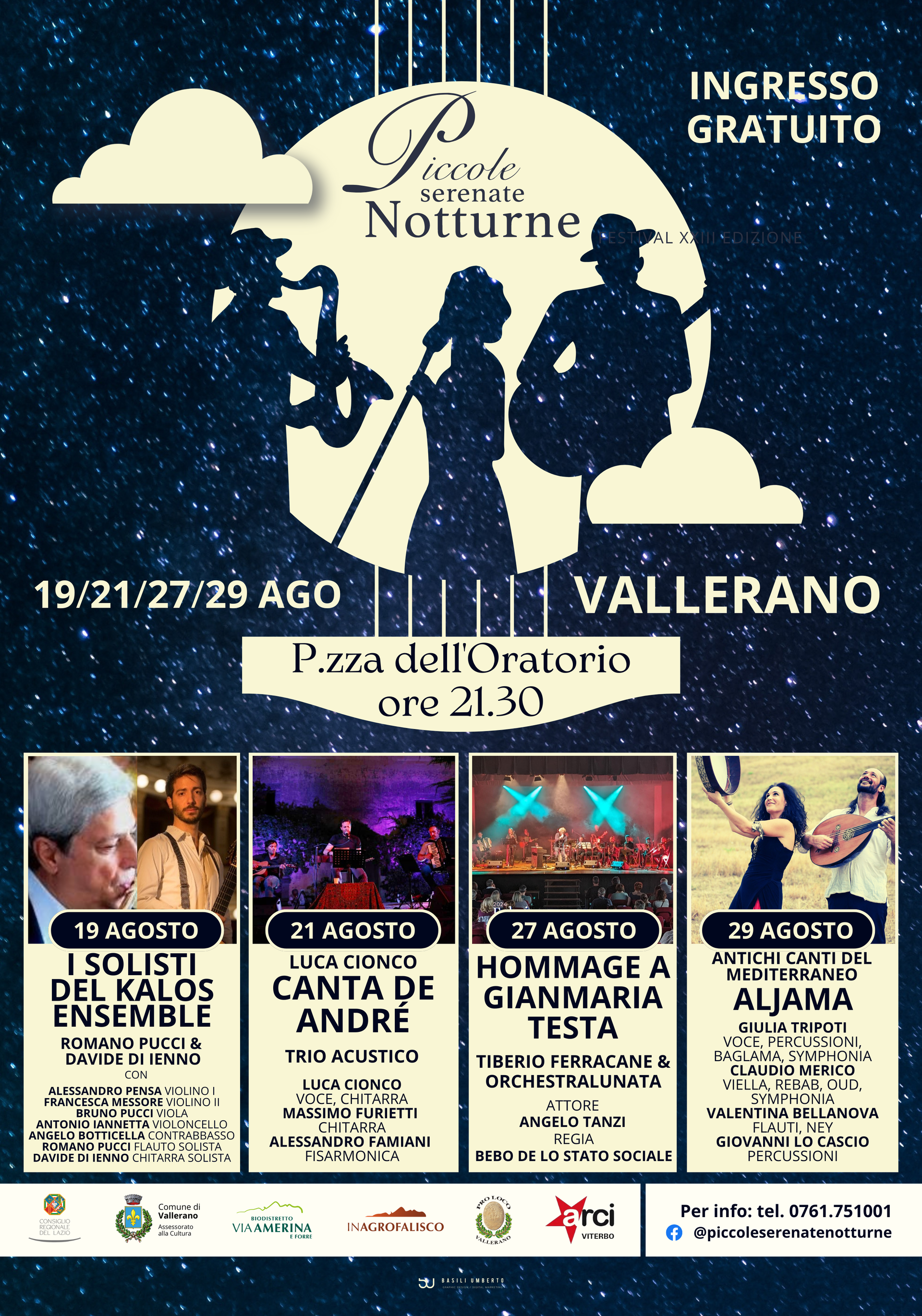 Nel cuore della Tuscia Viterbese torna il tradizionale appuntamento musicale dedicato a culture e linguaggi musicali prescelti tra canzone d’autore e suoni del Mediterraneo. Anche quest’anno “Piccole Serenate Notturne”, iniziativa organizzata dall’Assessorato alla cultura del Comune di Vallerano, propone per la sua 24esima edizione – un articolato programma in grado di soddisfare ogni aspettativa. I concerti avranno luogo, come di consueto, a piazza dell’Oratorio alle ore 21:30, con ingresso libero a tutti.