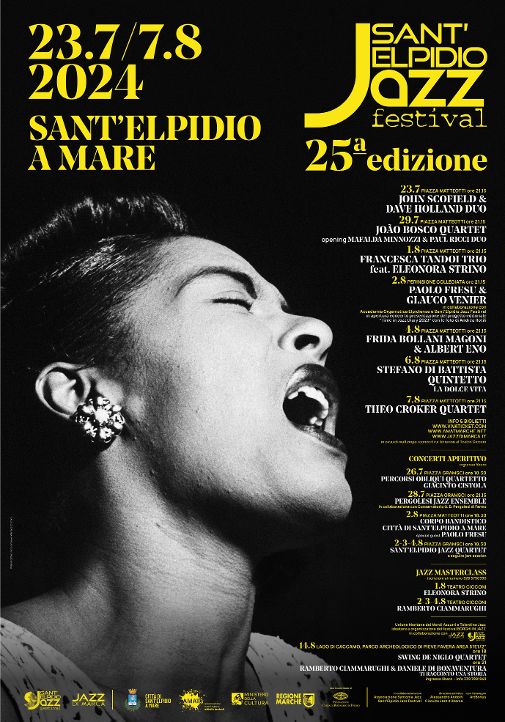 Cresce l’attesa per la venticinquesima edizione di Sant’Elpidio Jazz Festival, storica rassegna del circuito Jazz di Marca che si svolgerà a Sant’Elpidio a Mare (Fermo), organizzata dall’Assessorato alla Cultura e dall’associazione AMAT in collaborazione con Syntonia Jazz, per la direzione artistica di Alessandro Andolfi. Di grande qualità i concerti che si terranno alle 21:15, principalmente in Piazza Matteotti. Si accenderanno i riflettori martedì 23 luglio con John Scofield & Dave Holland Duo, formazione composta dal chitarrista statunitense e dal contrabbassista inglese che rappresentano due figure iconiche del jazz moderno. Il 29 sarà la volta di João Bosco Quartet, prestigiosa formazione diretta da João Bosco e completata da Ricardo Silveira, Guto Wirtti e Kiko Freitas, concerto aperto da Mafalda Minnozzi – Paul Ricci Duo, noto sodalizio trentennale che unisce la cantante e il chitarrista italo-statunitense. Si proseguirà giovedì 1° agosto con Francesca Tandoi Trio Feat. Eleonora Strino, spumeggiante band formata da Francesca Tandoi, Stefano Senni, Giovanni Campanella e dall’ospite Eleonora Strino. La serata successiva, in occasione del venticinquesimo del Sant’Elpidio Jazz Festival, in collaborazione con l’Accademia Organistica Elpidiense giunta al suo cinquantesimo anno di attività, ecco un duo d’eccezione: Paolo Fresu & Glauco Venier. Il trombettista e flicornista di blasone internazionale e il sopraffino pianista, in questa circostanza all’organo callido, si esibiranno presso la chiesa Perinsigne Collegiata. Il 4 toccherà a Frida Bollani Magoni & Albert Eno, duo che fonde il puro talento della giovanissima Frida Bollani Magoni con la poliedricità e l’esperienza di Albert Eno. Il 6 sarà protagonista Stefano Di Battista Quintetto – La Dolce Vita, gruppo diretto da uno fra i più conosciuti sassofonisti jazz italiani in ambito internazionale e completato da Matteo Cutello, Andrea Rea, Daniele Sorrentino e Luigi Del Prete. Mentre il 7 salirà sul palco Theo Croker Quartet, formazione di caratura internazionale composta da Theo Croker, Mike King, Eric Wheleer e Miguel Russell. Sant’Elpidio Jazz Festival sarà arricchito da una serie di altri eventi: 26 luglio alle 18:30, in Piazza Gramsci, Percorsi Obliqui Quartetto – Giacinto Cistola, il 28 alle 21:15, sempre nella stessa piazza, Pergolesi Jazz Ensemble. Giovedì 1° agosto, la masterclass diretta da Eleonora Strino al Teatro Cicconi, venerdì 2 agosto alle 18:30, in Piazza Matteotti, Corpo Bandistico Città di Sant’Elpidio a Mare Special Guest Paolo Fresu. 2, 3, 4 e 8 alle 18:30, in Piazza Gramsci, Sant’Elpidio Jazz Quartet e la masterclass del pianista Ramberto Ciammarughi al Teatro Cicconi. Per concludere, il 14 agosto alle 18:00, nell’ambito Jazz di Marca in collaborazione con l’Unione Montana dei Monti Azzurri e Tolentino Jazz, ideatore e organizzatore del festival Borghi in Jazz, al Lago di Caccamo, Swing De Niglo Quartet e, alle 21:00, un duo raffinato con protagonisti Ramberto Ciammarughi e Daniele Di Bonaventura, per il progetto intitolato Ti Racconto una Storia.