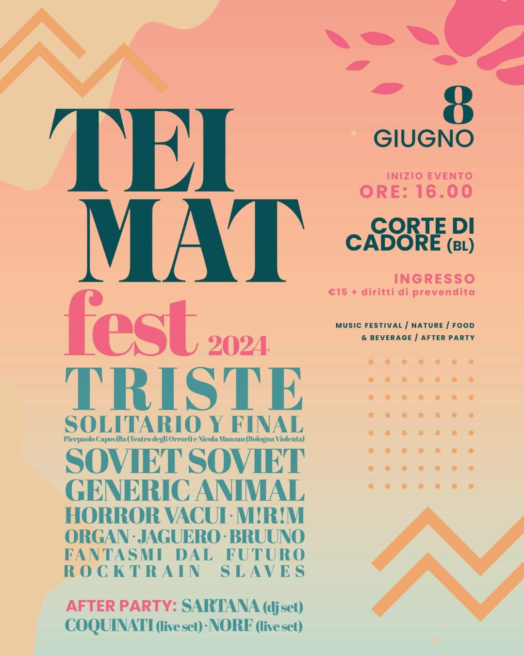 Il Teimat Fest vanta una line up che celebra la diversità e l’innovazione della musica alternativa italiana. Tra i nomi, tutti attesissimi, figurano Triste Solitario Y Final, Soviet Soviet, Generic Animal, Horror Vacui, M!R!M!, Organ, Jaguero, Bruuno, Fantasmi del Futuro e Rocktrain Slaves.