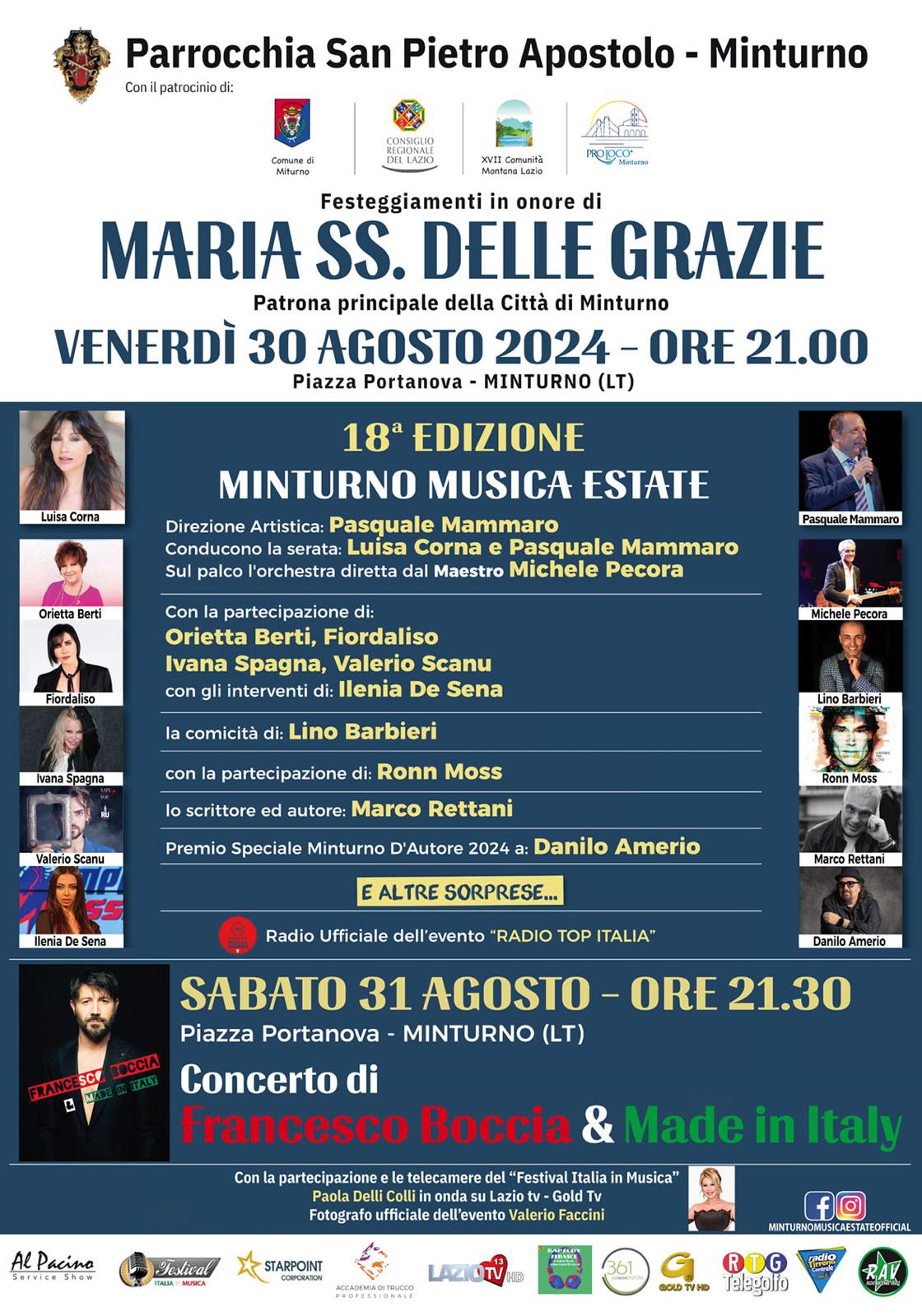 Venerdì 30 agosto alle ore 21.00 in Piazza Portanova a Minturno torna la 18ma edizione del Minturno Musica Estate 2024 inserito nella programmazione dei festeggiamenti in onore di Maria SS. Delle Grazie, patrona principale della Città di Minturno.