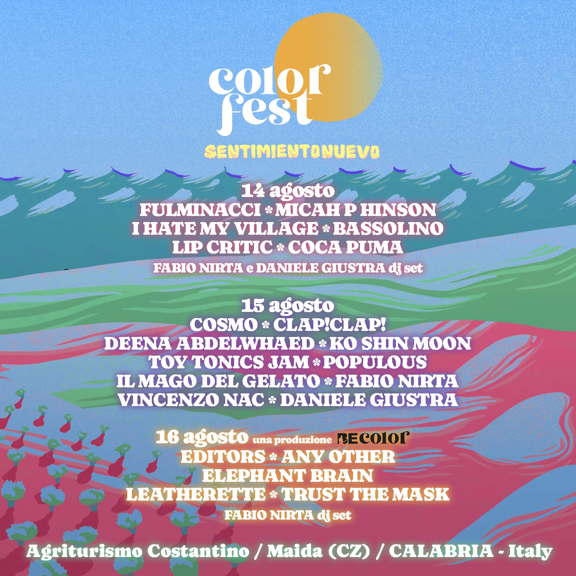 Un’edizione dalla visione profondamente contemporanea che sancisce una definitiva evoluzione per il festival nella direzione dell’internazionalizzazione delle proposte musicali; dando vita ad un cartellone dal grande valore artistico in cui coesistono i progetti nazionali più interessanti in termini di scrittura e ricerca sonora in Italia con proposte di forte caratura musicale nel panorama internazionale, che arrivano per la prima volta in Calabria proprio grazie al Color Fest.